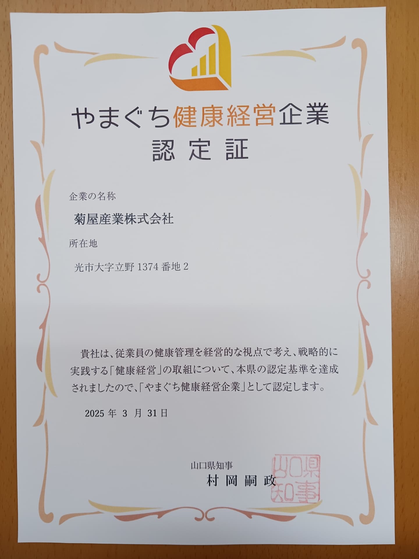やまぐち健康経営企業に認定されました。